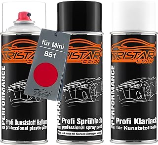 TRISTARcolor Autolack Spraydosen Set für Kunststoff Stoßstange für Mini 851 Chili/Solar Red Haftgrund Basislack Klarlack mit Weichmacher Sprühdose