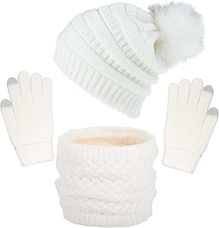 Mütze Schal Set Damen Wintermütze Warm Strickmütze Schal Touchscreen Handschuh Damen Winter Kombi Set Beanie mit Pompon Grobstrick Schal Damen Geschenk Winterzubehör Warm Outdoor Sport